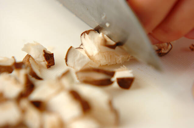 シイタケは石づきを切り落として粗みじん切りにする。ニラは根元を少し切り落とし、長さ1cmに切る。