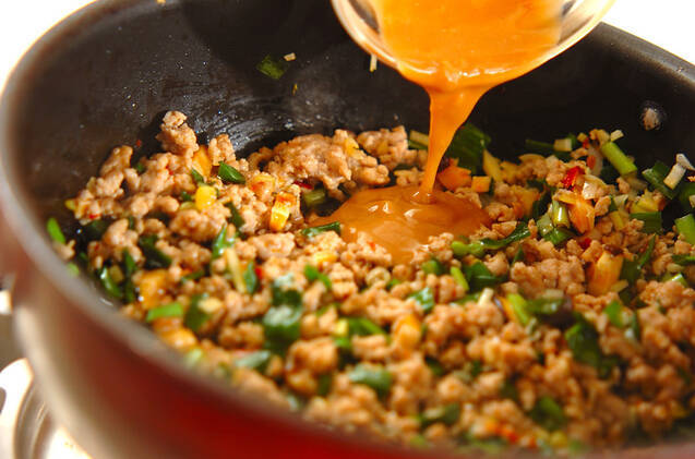 シイタケ、ニラ、白ネギ、ショウガを加え、しんなりするまで炒めたら、<調味料>の材料を加えて軽く炒め合わせる。