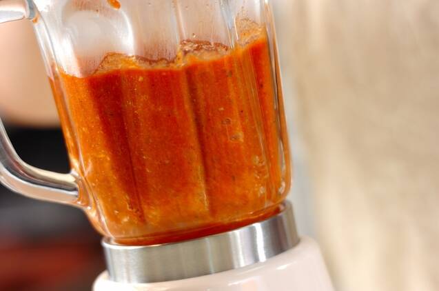 (2)の火を止め、粗熱が冷めたらミキサーに入れ、かくはんする。