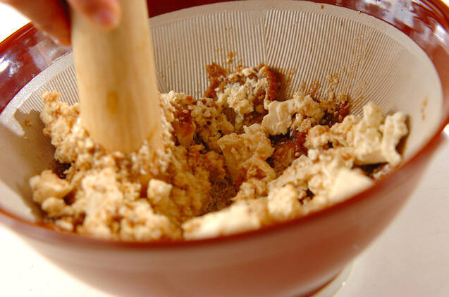 <和え衣>のクルミは包丁で粗く刻み、すり鉢に他の<和え衣>の材料と一緒に入れてしっかりすりつぶす。