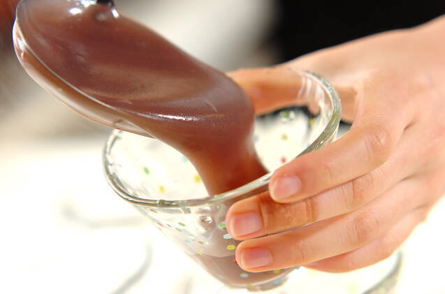 器に流し入れ、冷蔵庫で冷やし固める。食べる直前に抹茶を茶こしで振る。