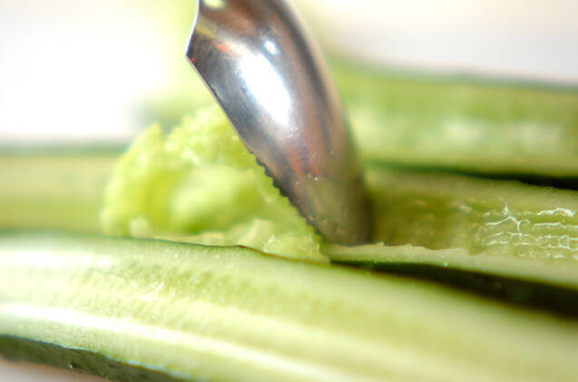 キュウリは両端を切り落として縦半分に切り、スプーン等で中央の種を削り取り、長さ3cmに切る。