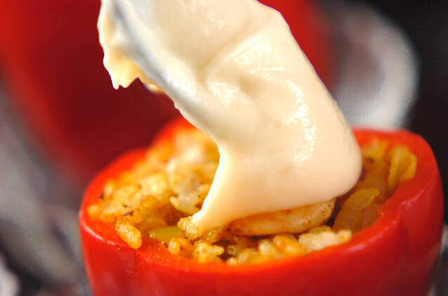 全体に混ざったらカレー粉を加えて混ぜ、塩コショウで味を調える。オレンジパプリカと赤パプリカにご飯をつめてホワイトソースをかけ、ピザ用チーズをのせる。