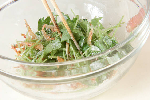 全ての材料に薄く小麦粉(分量外)をまぶす。<かき揚げ>はミツバと桜エビを混ぜ合わせた中に小麦粉(分量外)少々を加えてまぶす。