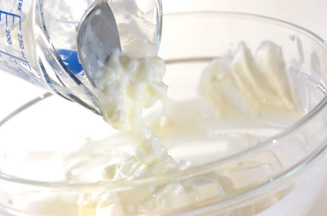 <ヨーグルトクリーム>を作る。ボウルに生クリーム、グラニュー糖を入れ、泡立て器でピンと角が立つくらいまで泡立て、プレーンヨーグルトを加えて混ぜ合わせる。