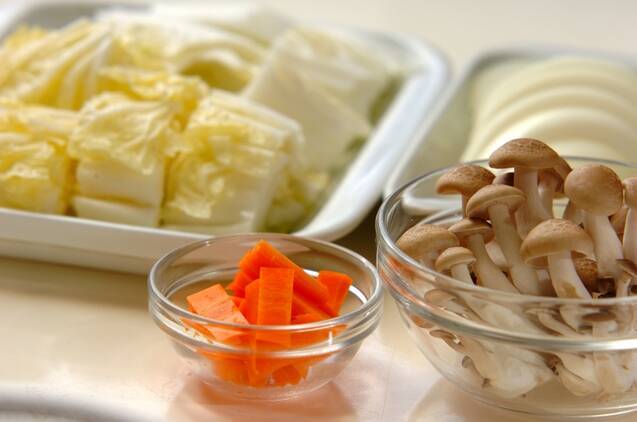白菜はザク切りにする。玉ネギは幅1cmに切る。ニンジンは皮をむき、短冊切りにする。シメジは石づきを切り落とし、小房に分ける。