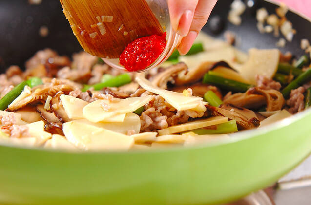 豚ひき肉の色が変わったらシイタケ、ゆでタケノコを加えて炒め合わせ、全体に炒められたら豆板醤を加え、からめるように炒め合わせる。
