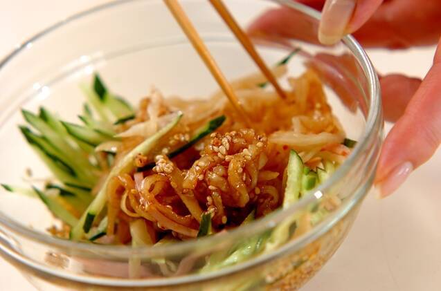 ボウルに切干し大根、キュウリ、ハムを入れ、<甘酢液>の材料を加え、よく和える。