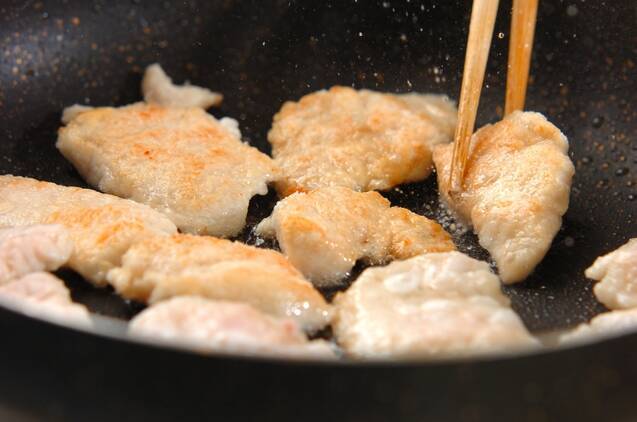 鶏むね肉に片栗粉を薄くまぶし、サラダ油大さじ1を中火で熱したフライパンで両面に焼き色がついたら、いったん取り出す。
