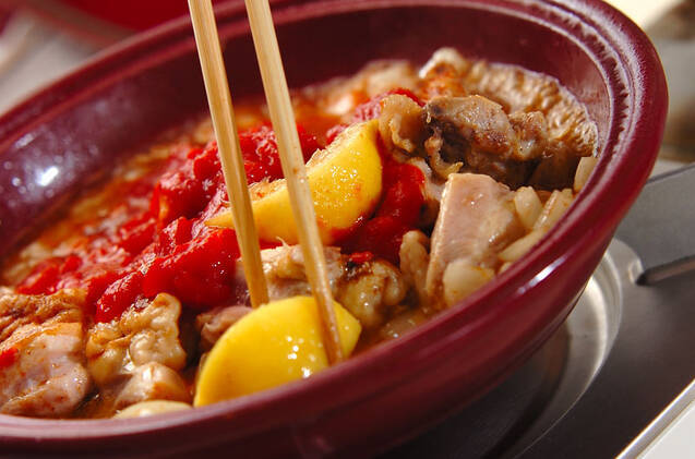 塩レモン、水煮トマト、水、ハチミツを加え、蓋をして弱火で20分ほど加熱する。焦げ付きそうな時は水を少量加える。