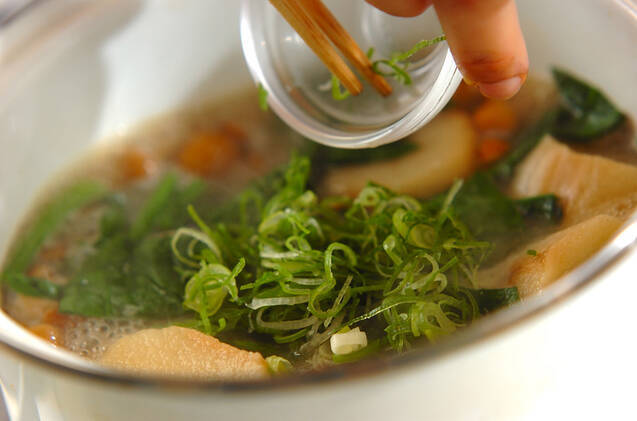 鍋にだし汁を入れて強火にかけ、煮たったら麩を加えて合わせみそを溶き入れる。ナメコ、ホウレン草を加え、再び煮たつ直前に火を止めて刻みネギを加える。器に注ぎ分ける。