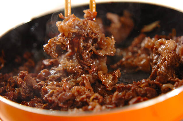 フライパンにサラダ油を強火で熱し、牛肉、ショウガを炒め合わせ、<調味料>の材料を加える。煮たったら中火にし、煮汁が少なくなるまで炒める。