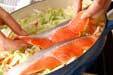 フライパン、又は鍋に薄くサラダ油を敷き、玉ネギ、ニンジン、キャベツを広げて入れる。その上に、鮭、豆腐を並べ、シメジを散らす。