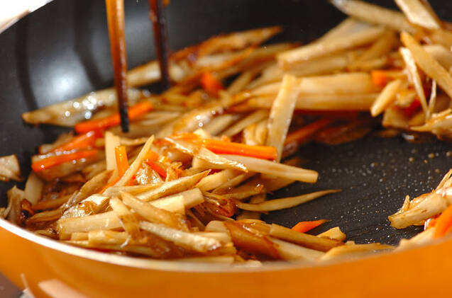 <調味料>の材料を加え、汁気がほとんどなくなるまで炒め合わせる。器に盛り分け、指先で白ゴマをつぶしながら振る。