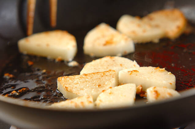 フライパンにニンニクとバターを入れて火にかけ、バターが溶けて香りがたったら長芋を入れる。両面に焼き色がついたらゆでタコ足を加える。