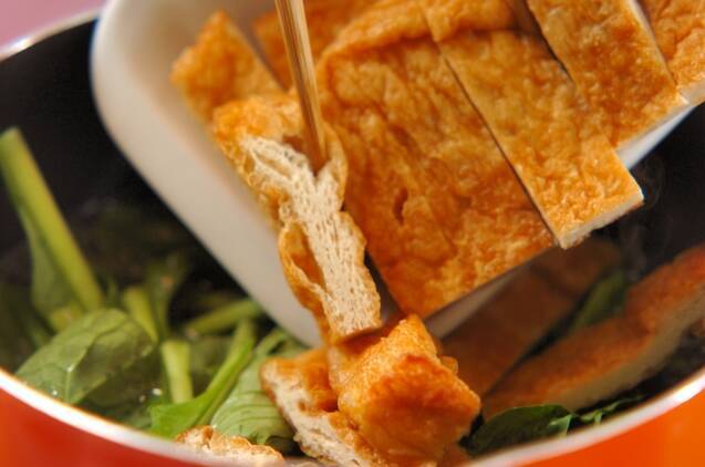 鍋に<合わせだし>の材料を入れて中火にかけ、煮たったら小松菜と油揚げを加え、小松菜がしんなりするまで火を通す。
