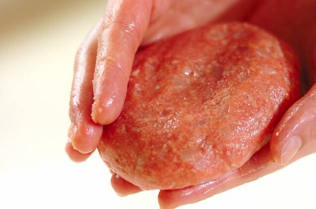 手にサラダ油をぬって(1)を2~4等分し、1個ずつキャッチボールをする要領で空気を抜き、小判型に形を整える。