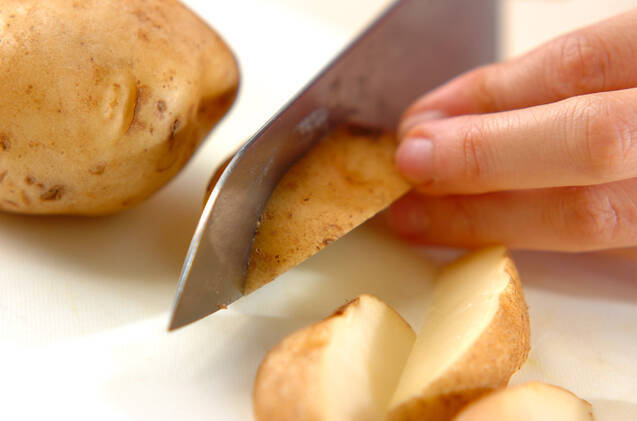 ジャガイモは皮ごときれいに水洗いし、1個を8~12のくし切りにし、水に放つ。