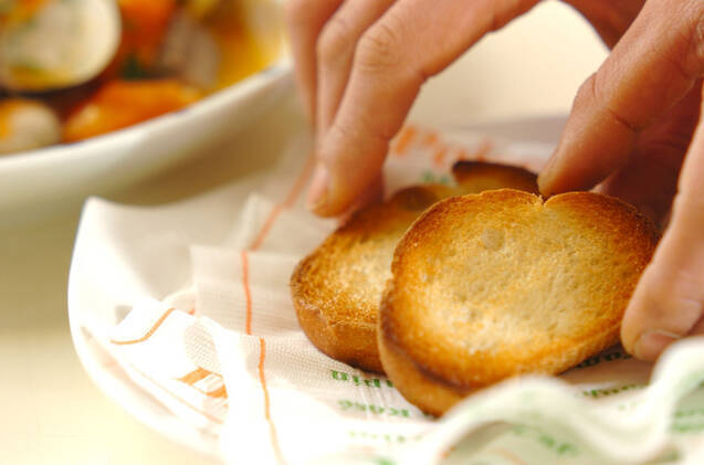 サワラ、ハマグリ、酒、水を加えてフライパンに蓋をし、貝が開いてサワラに火が通ったら塩で味を調え、器に盛る。イタリアンパセリを散らし、バゲットを添える。
