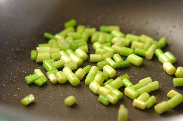 中華鍋を強火で熱し、サラダ油小さじ1を加えてニンニクの芽を炒め、色が鮮やかになったらいったん取り出す。