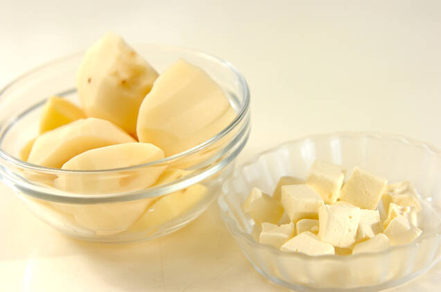 ジャガイモは皮をむき、4等分に切る。クリームチーズは1cm角に切る。卵は殻ごときれいに水洗いし、アルミホイルに包む。