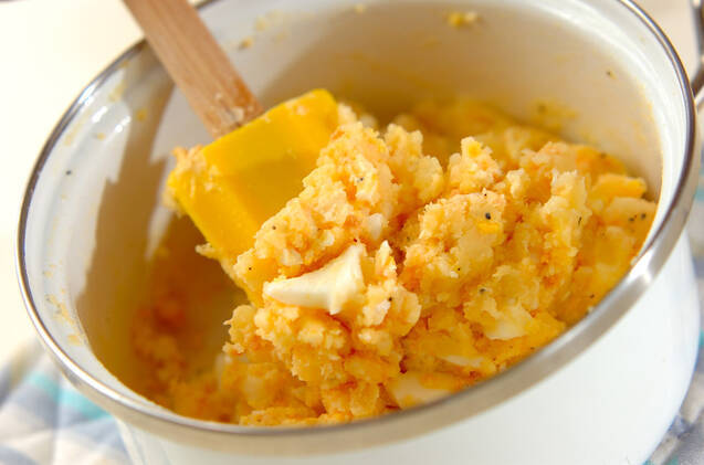 ジャガイモとゆで卵をマッシャーでつぶし、全ての材料を混ぜ合わせ、器に盛る。