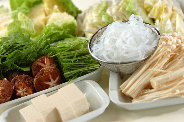 豆腐、白菜、白ネギは水洗いして、食べやすい大きさに切る。シイタケは石づきを落とし、固く絞ったぬれ布巾で汚れを拭き取り、軸と笠に切り分け、軸は縦半分に裂き、笠には飾り切りをする。エノキは水洗いして根元を切り落とし、食べやすい大きさに分ける。水菜は根元を切り落とし、きれいに水洗いして長さ4cmに切る。水煮葛きりはザルに上げ、水洗いして水気をきる。乾燥の葛きりの場合は、袋の指示通りにゆでてもどす。