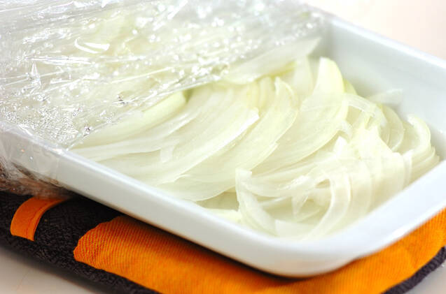 <タネ>のツナは汁気をきる。玉ネギは薄切りにして耐熱容器にのせ、ラップをして電子レンジで1分加熱し、しんなりさせる。電子レンジは600Wを使用しています。固ゆで卵は細かく刻み、全ての<タネ>の材料を混ぜ合わせる。