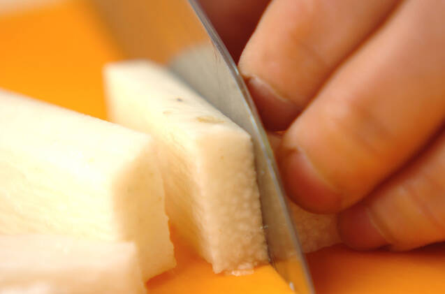長芋は皮をむき、酢を入れた水に10分つけてアク抜きをする。水気を拭き取り、グリーンアスパラ位の大きさに切る。