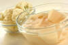 カリフラワーは小房に分け、軸はかたい外皮を厚めにむいて、ひとくち大の乱切りにする。