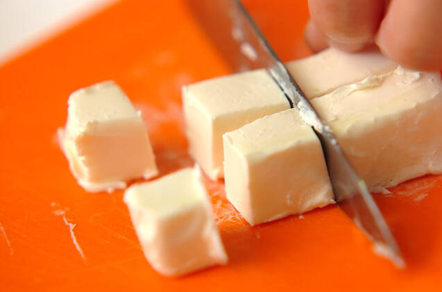 ジャガイモは皮をむいて2cm角に切る。鍋に水、ジャガイモ、塩を入れ、ゆでる。クリームチーズを1cm角に切る。