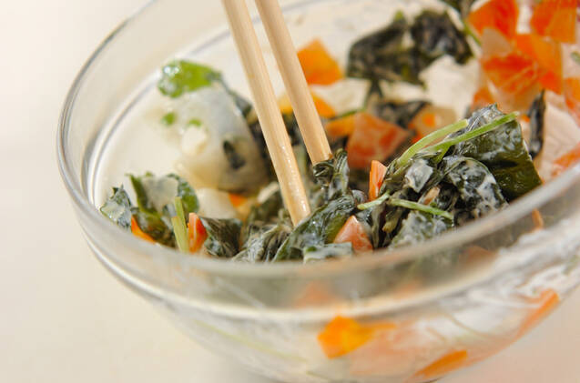 熱湯に分量外の塩を加え、レンコン、ニンジン、ミツバを入れサッとゆでて水に取り、粗熱が取れたら水気をしっかりきる。<合わせマヨ>のボウルにワカメと一緒に入れて和え、器に盛る。