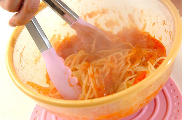 (4)のスパゲティーがゆで上がったら、(2)の<トマトソース>のボウルに入れ、全体にからめる。器に盛り、バジルを振る。<ワンポイントアドバイス>バジルの代わりにオレガノ、又はタバスコや粉チーズもよく合います。ゆで上がったスパゲティーにオリーブ油をからめ、器に盛ってトマトソースをかけてもおいしいですよ。トマトソースの作り置きがあれば、スパゲティーをゆでている間にソースを温めるだけでいいので、短時間でおいしいトマトソースパスタが楽しめますね!