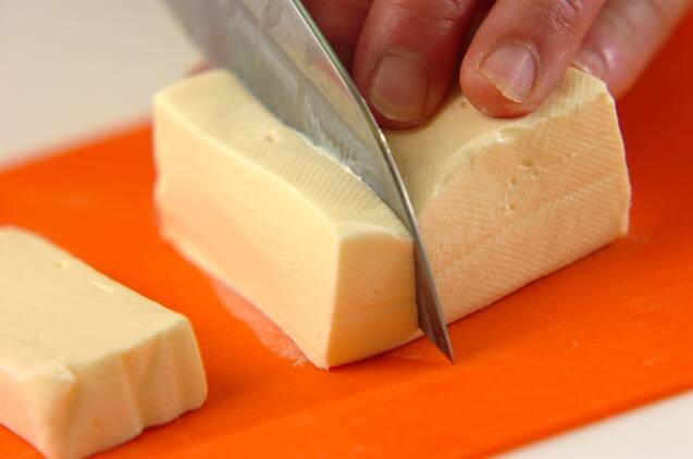 クリームチーズは厚さ1cmを目安に、トマトの薄切りと同じ枚数用意する。