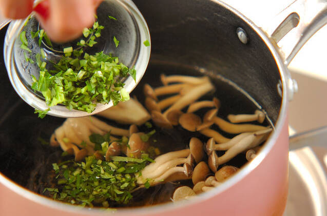 残りのだし汁にシメジを加え、再び煮たったら火を止めてミツバを加え、ひと混ぜして器に注ぐ。