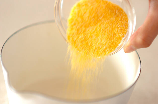 小鍋にコーングリッツと水を入れて火にかける。フツフツとなってきたら火から下ろし、そのまま冷ましておく。