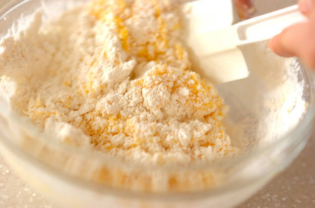 1を加えてよく混ぜたら、振るっておいた粉類を加え、泡立て器からゴムベラに変えてサックリと混ぜる。