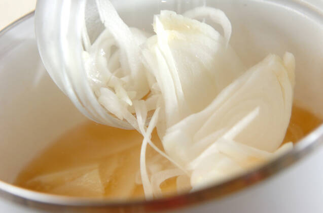 鍋に<スープ>の材料、ジャガイモを入れて強火にかけ、煮たったら新玉ネギを加え、再び煮たったら火を弱めて蓋をして5~6分煮る。