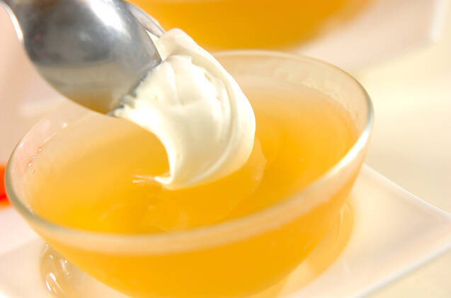 生クリームと砂糖を合わせてトロリと泡立て、リンゴのゼリーにのせ、ゆで小豆を添える。