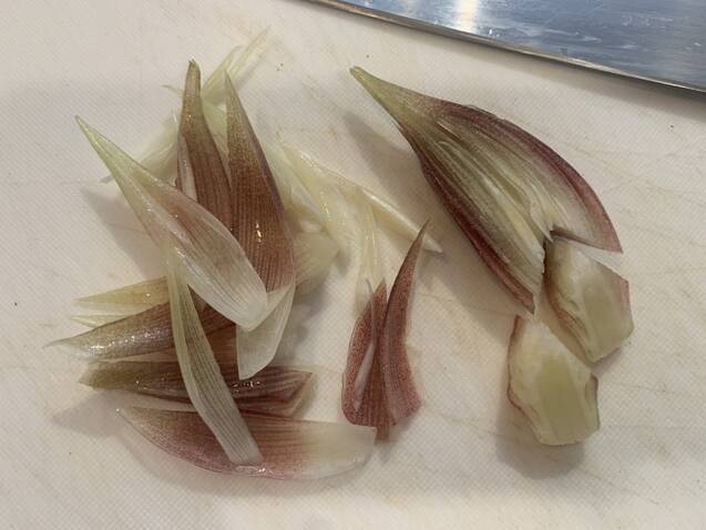 ミョウガは、縦に半分に切る。下を三角に切り落とす(ここは刻んで納豆や味噌汁に)。残った大きい方は外側から手でバラす。大きいものは縦半分に切る。
