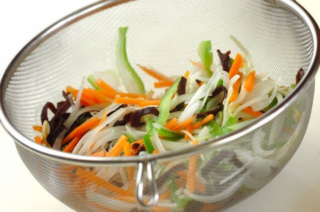<チャプチェ>を作る。キクラゲ、玉ネギ、ニンジン、ピーマン、モヤシを熱湯でサッとゆでる。ザルにあけ水気をきる。