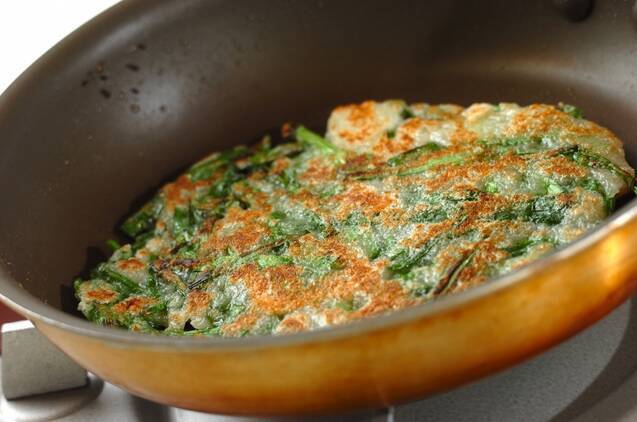 フライパンにゴマ油を入れ、中火にかける。(5)を薄くのばす。弱火~中火で両面がカリッとするまでじっくりと焼く。取り出し、食べやすい大きさに切り<タレ>を添える。