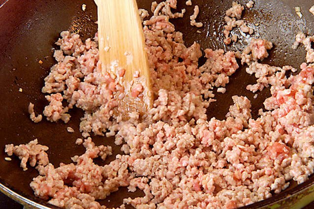 中華鍋にサラダ油、ショウガ、ニンニクを強火にかけて炒め、香りが立ってきたら豚ひき肉を加えて炒め合わせる。