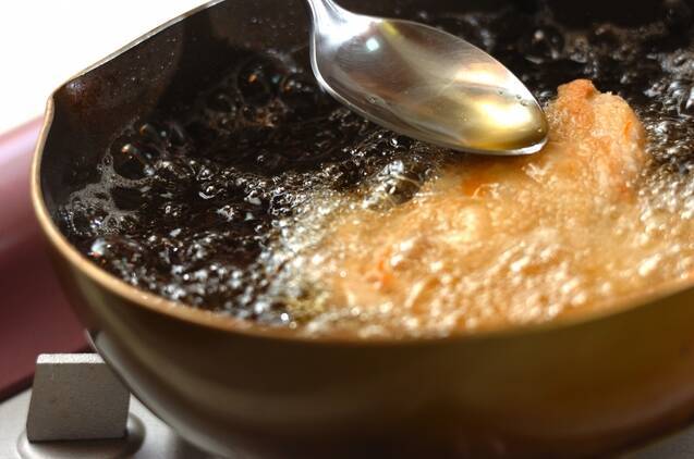 スプーン等で揚げ油を鶏肉にかけながら(上面からも火を入れて)4分揚げ、返して2分油をかけながらじっくりあげ、油をきって食べやすい大きさに切る。