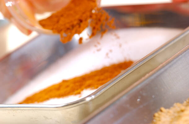 グラニュー糖を3等分に分けそれぞれシナモンパウダー、きな粉と分量外の塩少々、抹茶と塩と混ぜ合わせる。