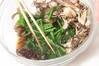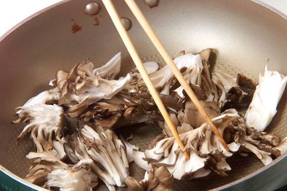マイタケは石づきを切り落として小房に分ける。フライパンに入れ、塩少々を振って空煎りし、冷ましておく。