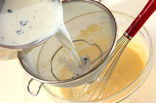 ボウルに卵黄を入れてほぐし、グラニュー糖を加えて白っぽくなるまで泡立て器ですり混ぜる。 振るっておいた粉類を加えて軽く混ぜ合わせ、沸騰直前の1の牛乳を網を通しながら少しずつ加え、泡立て器ですばやく混ぜる。