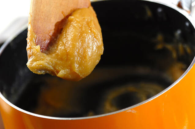 <ユズみそ>を作る。小鍋に白みそ、砂糖、みりんをよく混ぜ合わせ、弱火にかける。木ベラで混ぜながら少しかために練り、火を止める。すりおろしユズ皮、ユズ汁を加えてよく混ぜ合わせる。