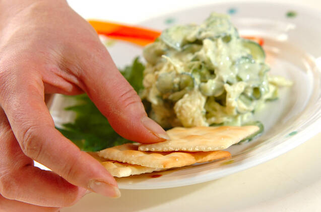 器に大葉をしいて(2)を盛り、クラッカーを添える。