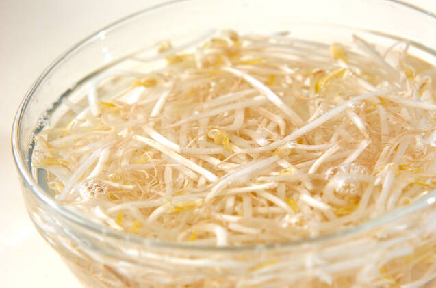 モヤシはたっぷりの水に放ち、パリッとしたらザルに上げる。